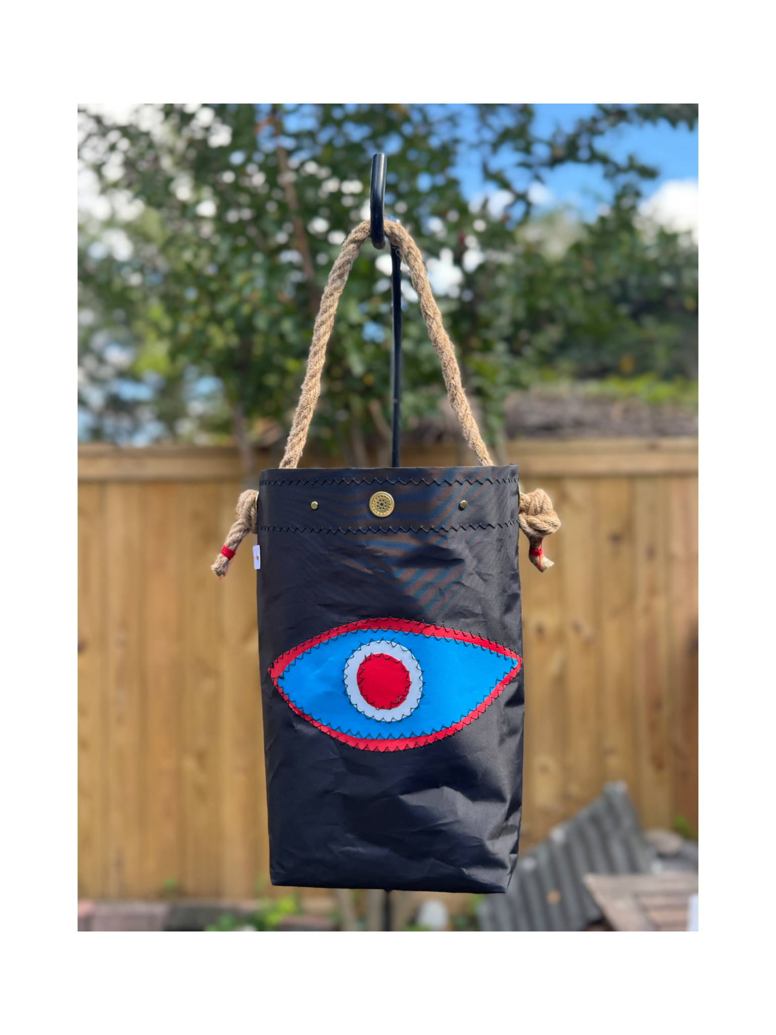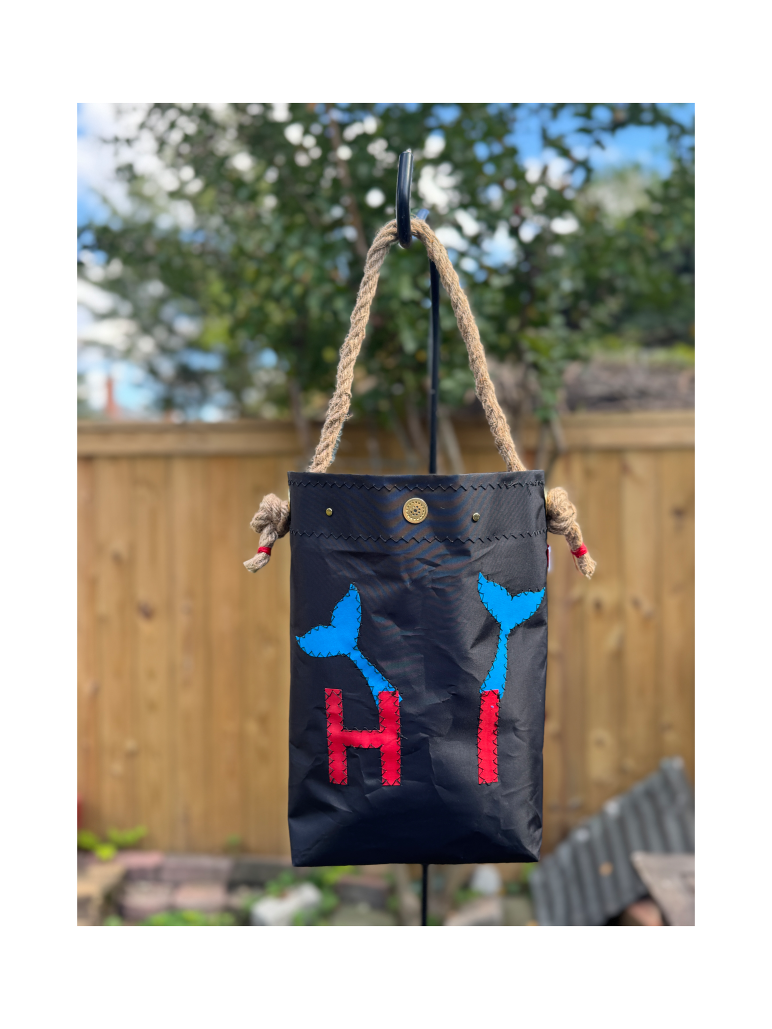Charming Black Sailcloth Bag with Blue Fish Eye on front and Hatteras Island FishTail lettering on the back.