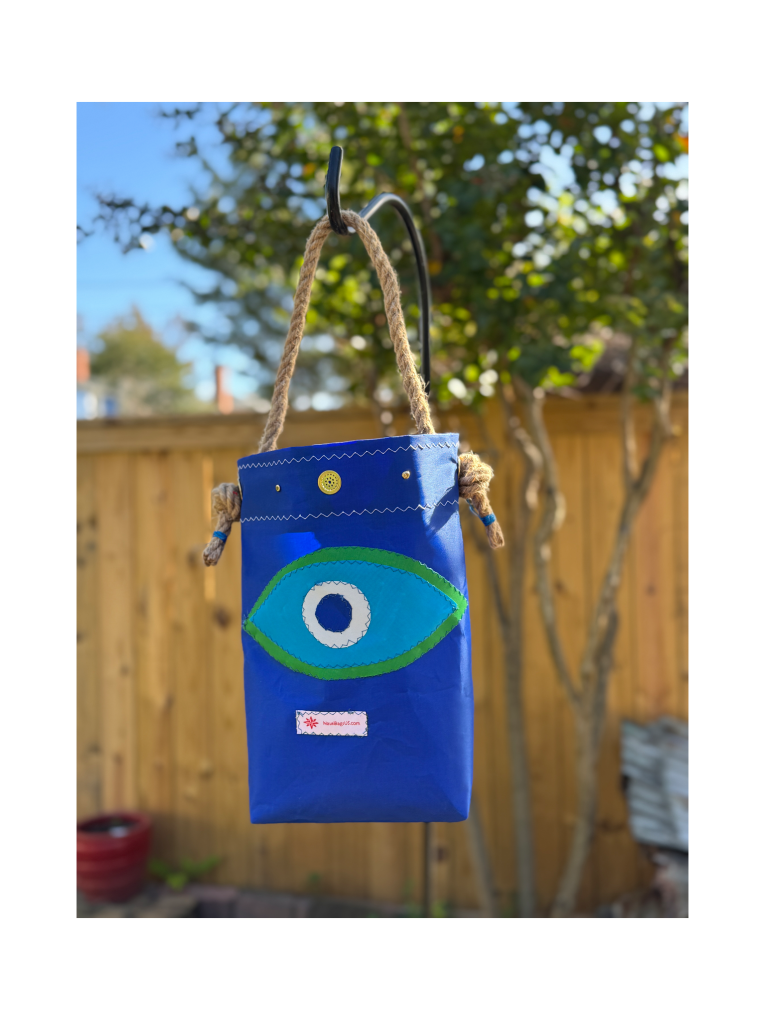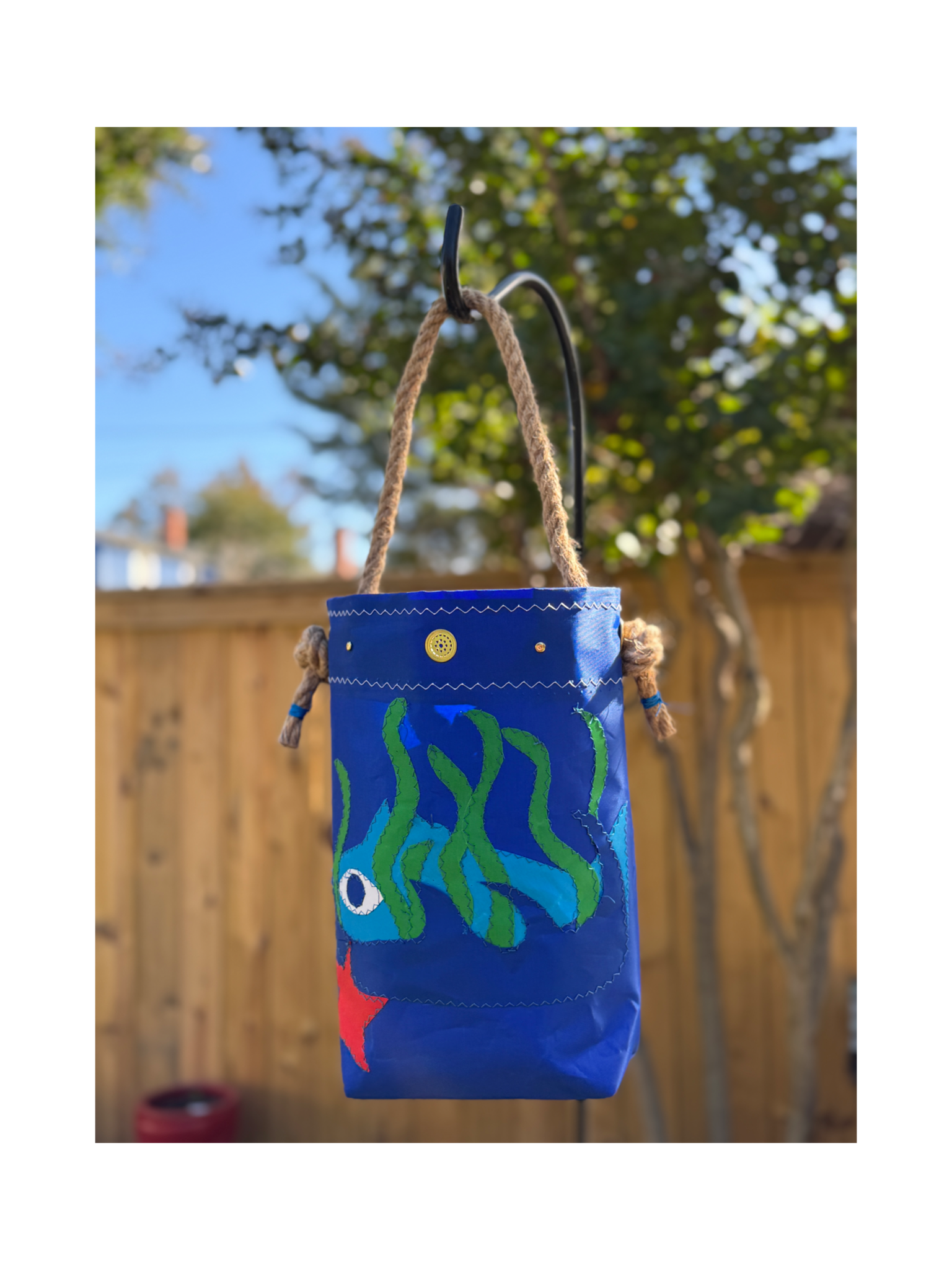 This adorable bag features a stylized fish swimming through seaweed in a sea of blue. The other side features a big green and blue fish eye! Interior is lined with white sailcloth.