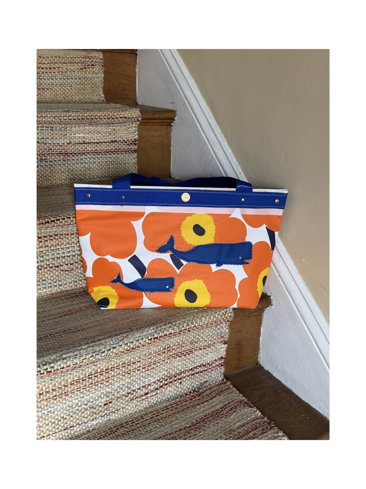 This bag has a matching wide pocket on pocket inside and trimmed with blue webbing and blue webbed handles. Brass grommets and brass rivets give it that special nautical vibe!