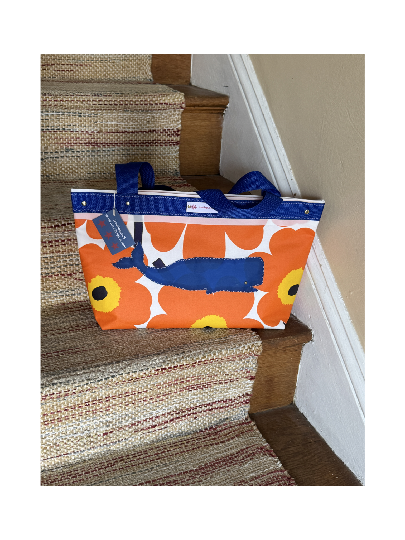 This "Oh so cute!" shoulder tote features a family of Blue Whales on Iconic Marimekko fabric. Wax coated Marimekko and 4 oz Blue Sailcloth is a winning combination that makes this and other bags in the collection water repellent, stain and fade resistant and virtually indestructible.