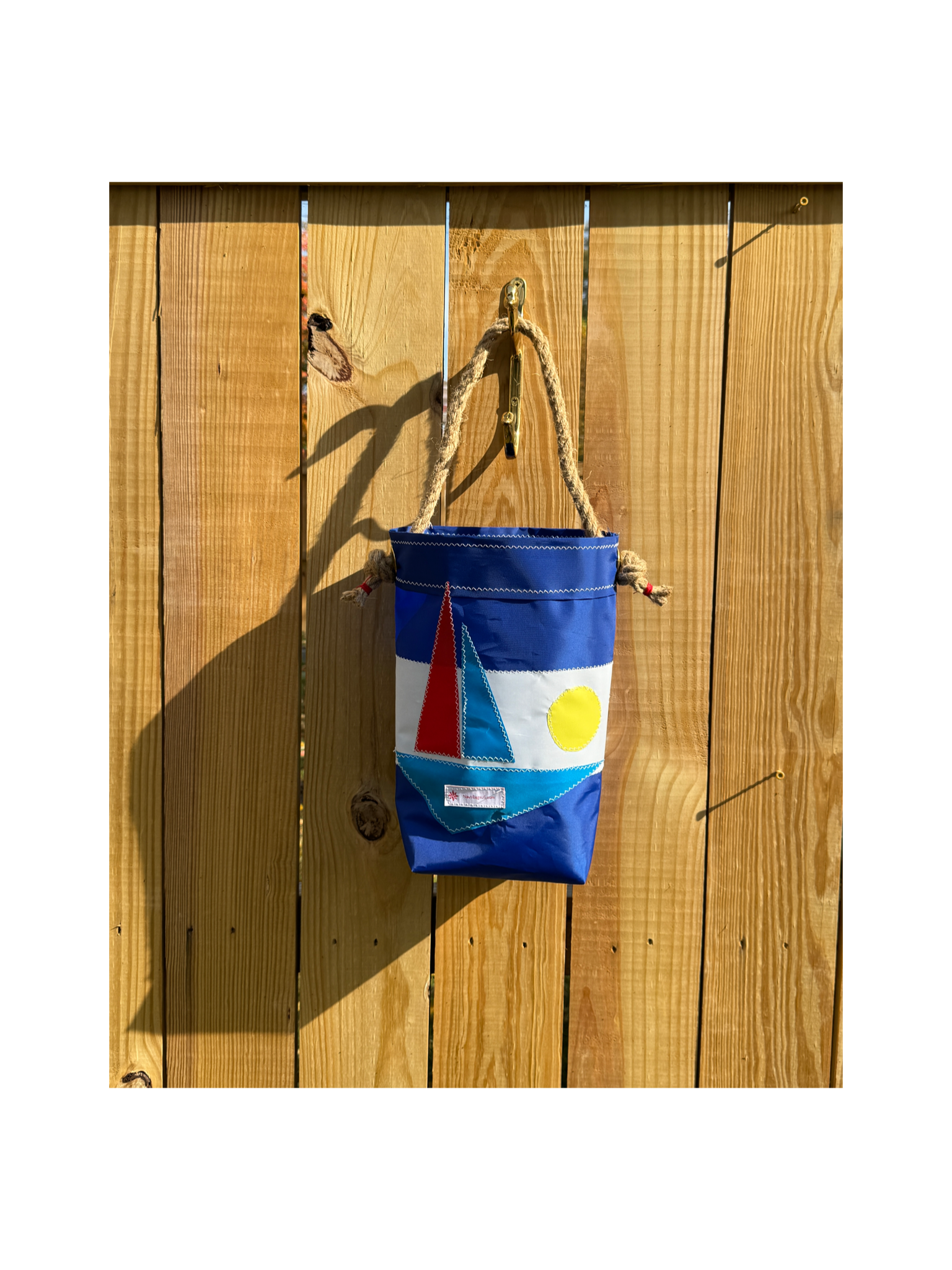 Beautiful marine blue sailcloth bag with white dolphins, heart, sailboats and bright yellow sun. Bag is finished with grommets and rope handle with whip twined pigtail knots.