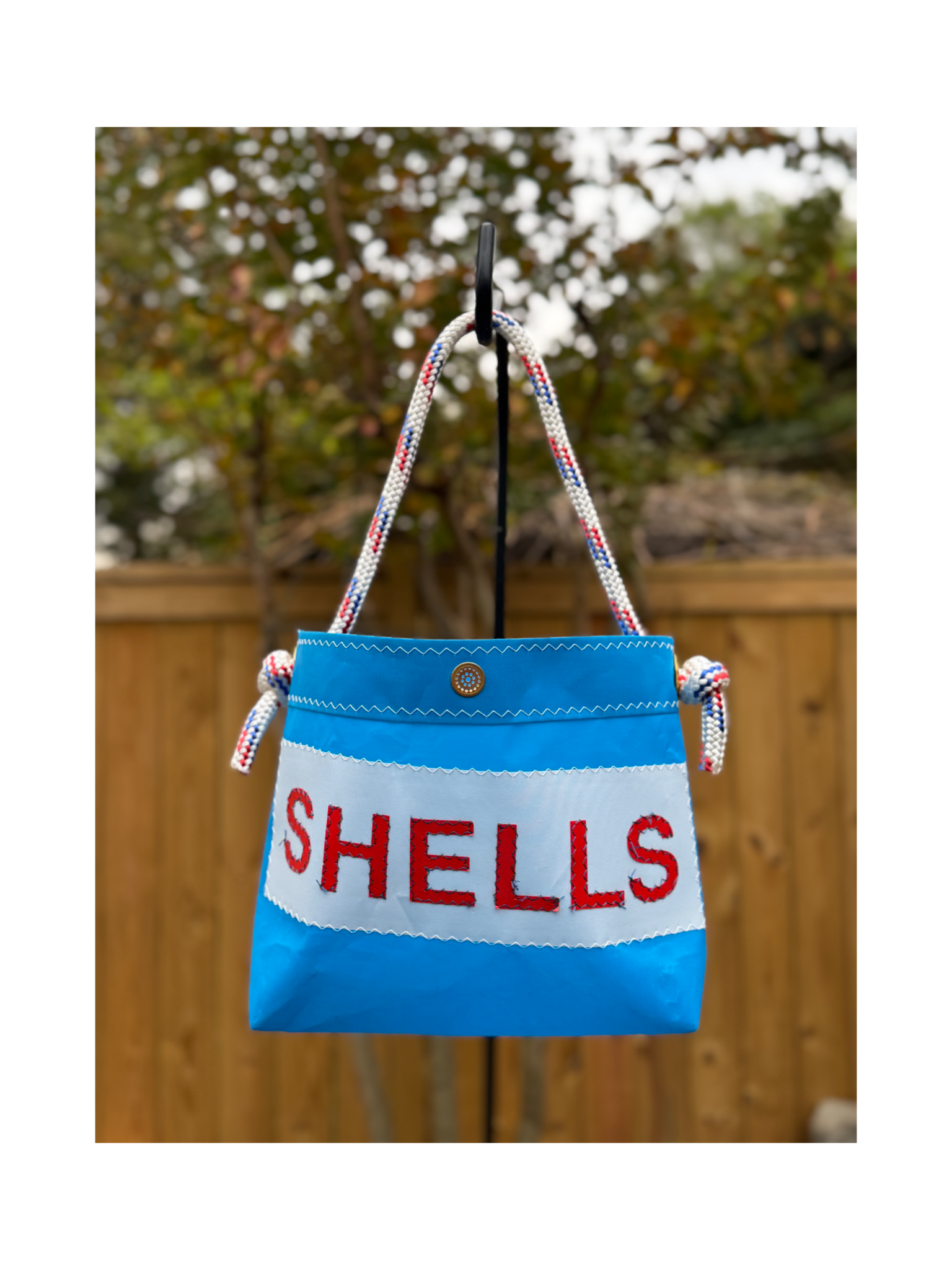 Take this cutie pie with you for a day of shell collecting at your favorite beach! Marine blue sailcloth with blue lettering and cute details in all American-Red, White and Blue.