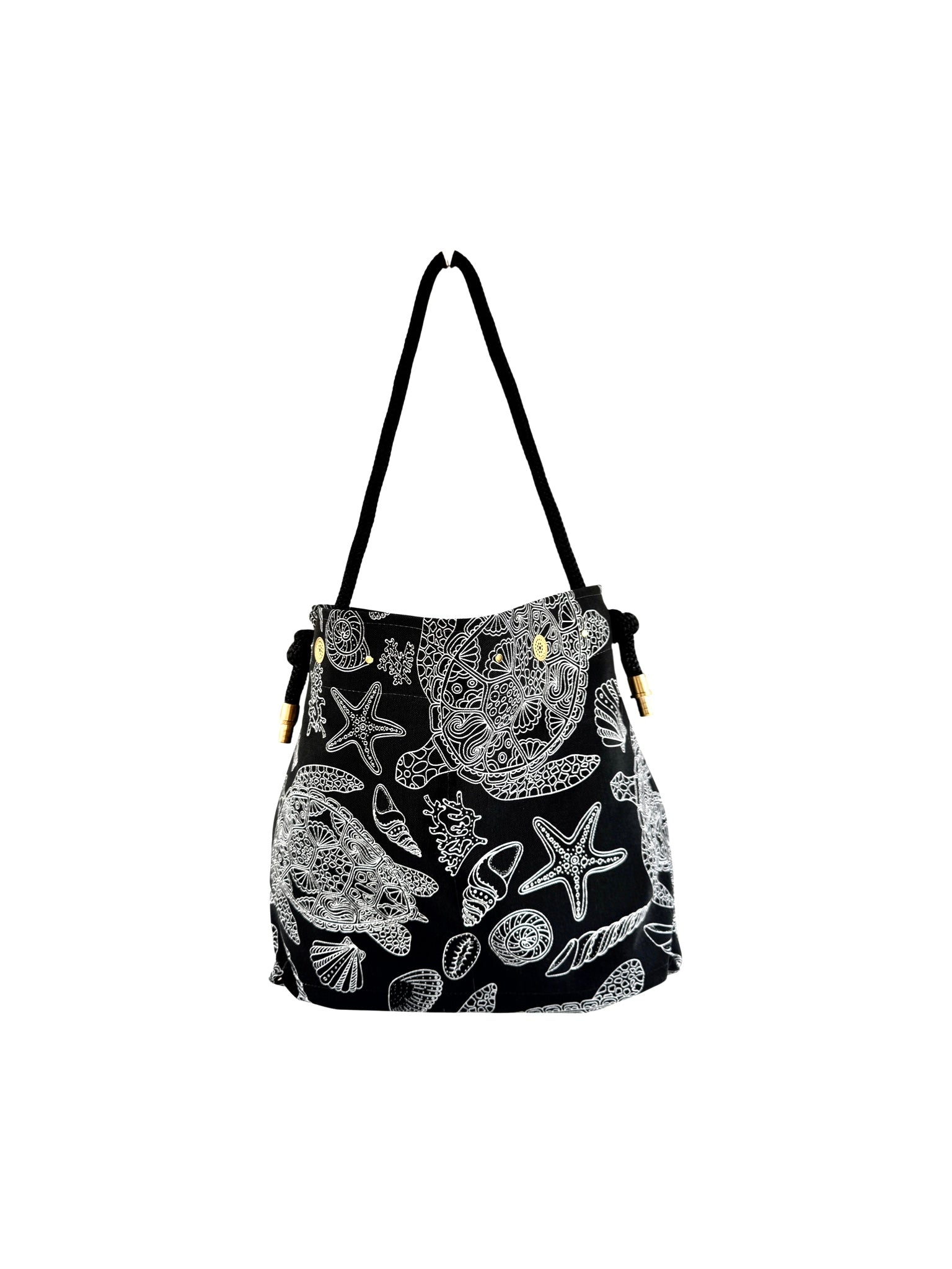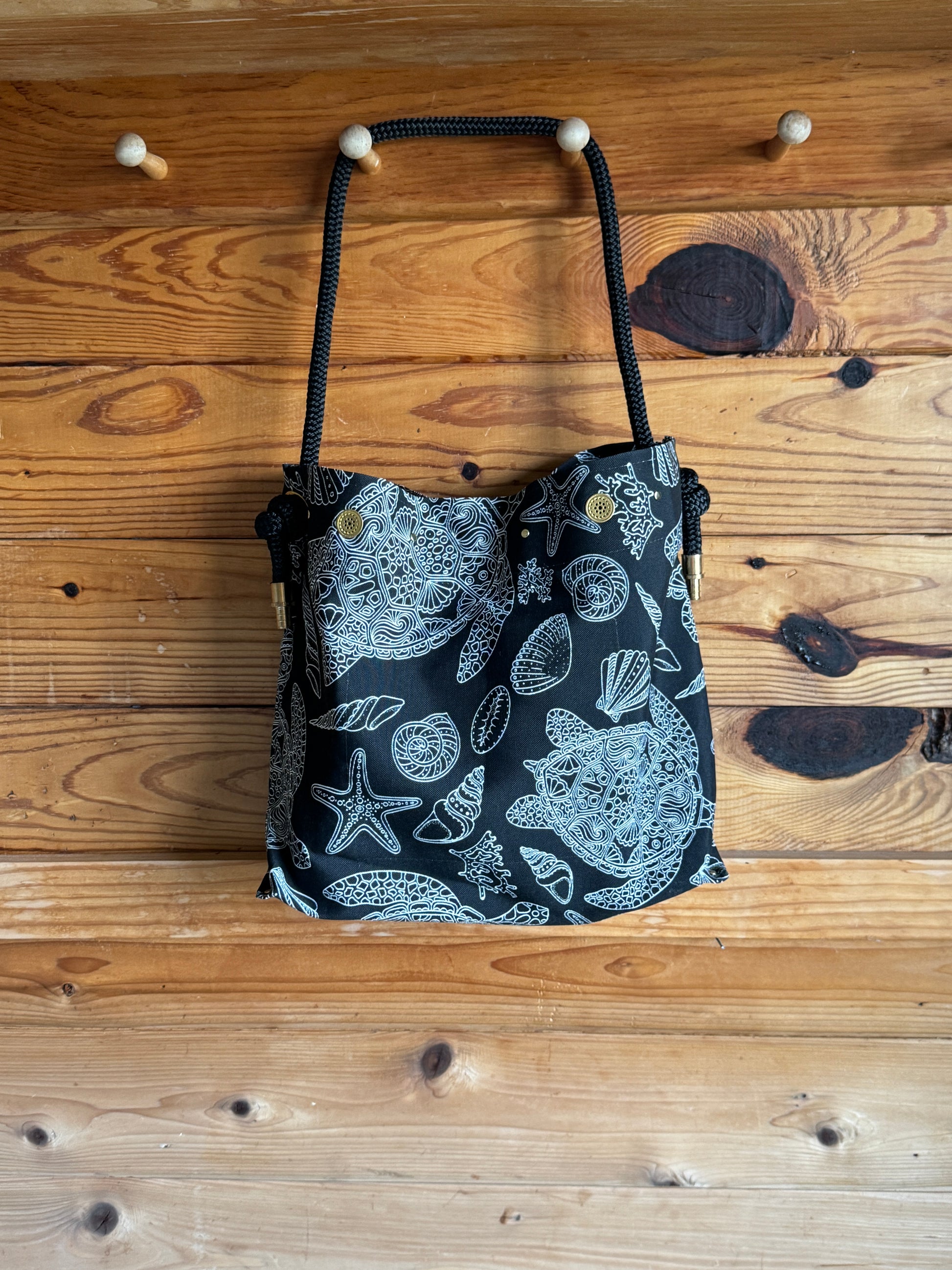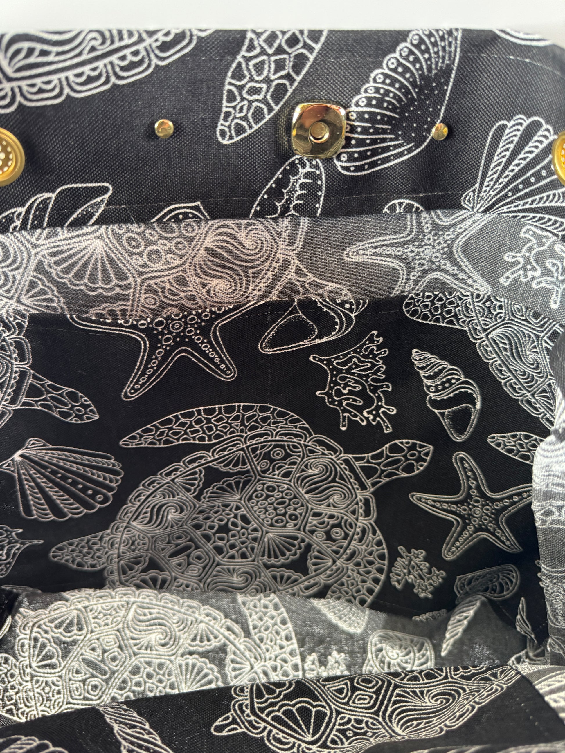 Premium Fabric in black with turtle and shells print - fabric is resistant to fading, stains, mold and mildew as well as water resistant.