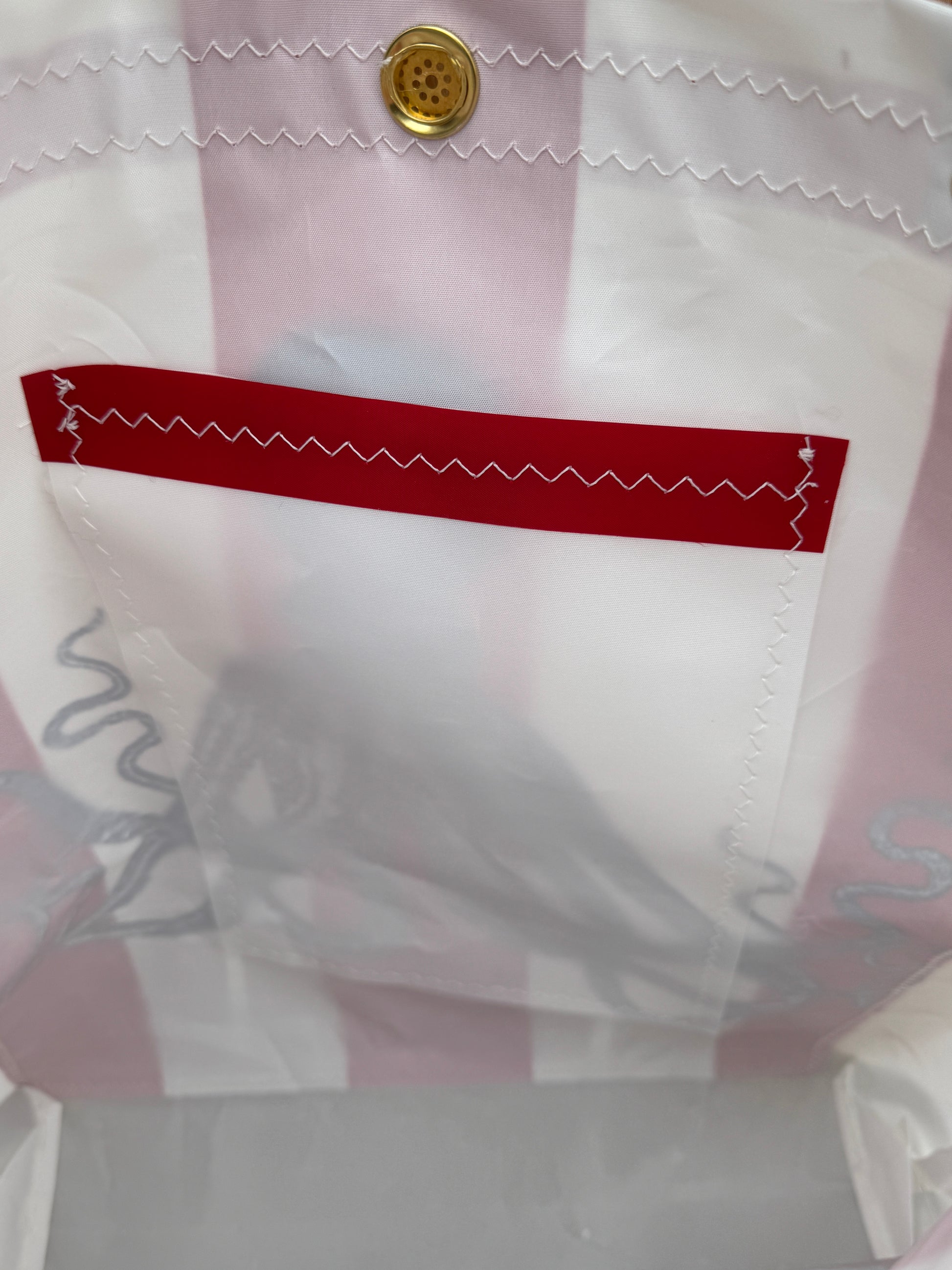 A sexy nautical bag indeed! A big, beautiful blue Cephalopod on Red and White adorns clean, white sailcloth. This bag has all the bells and whistles including red banding, deep pocket and black webbed handles. Brass grommets and rivets complete the look.