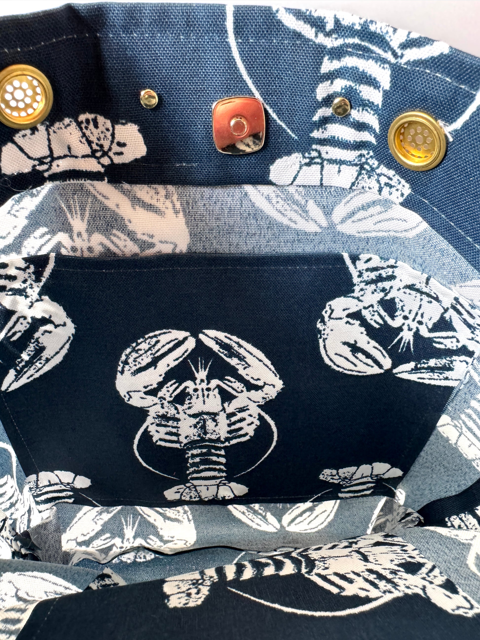Premium Fabric in oxford blue with white lobsters - fabric is resistant to fading, stains, mold and mildew as well as water resistant.