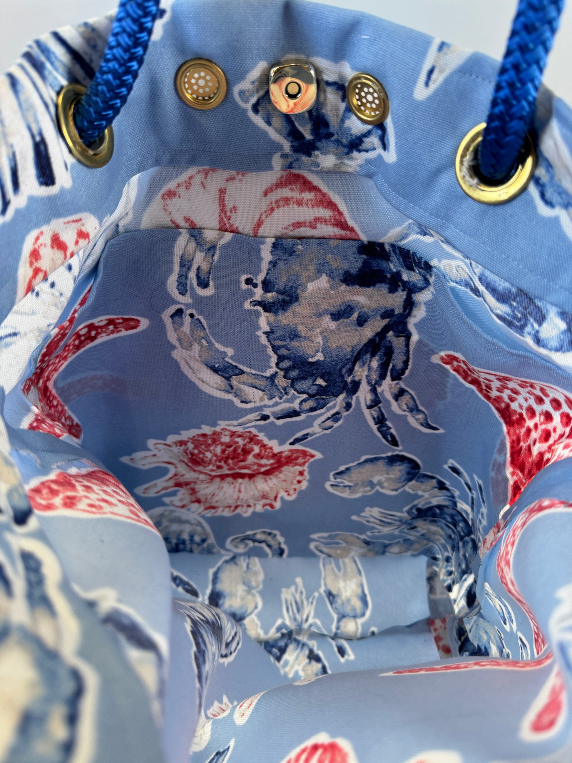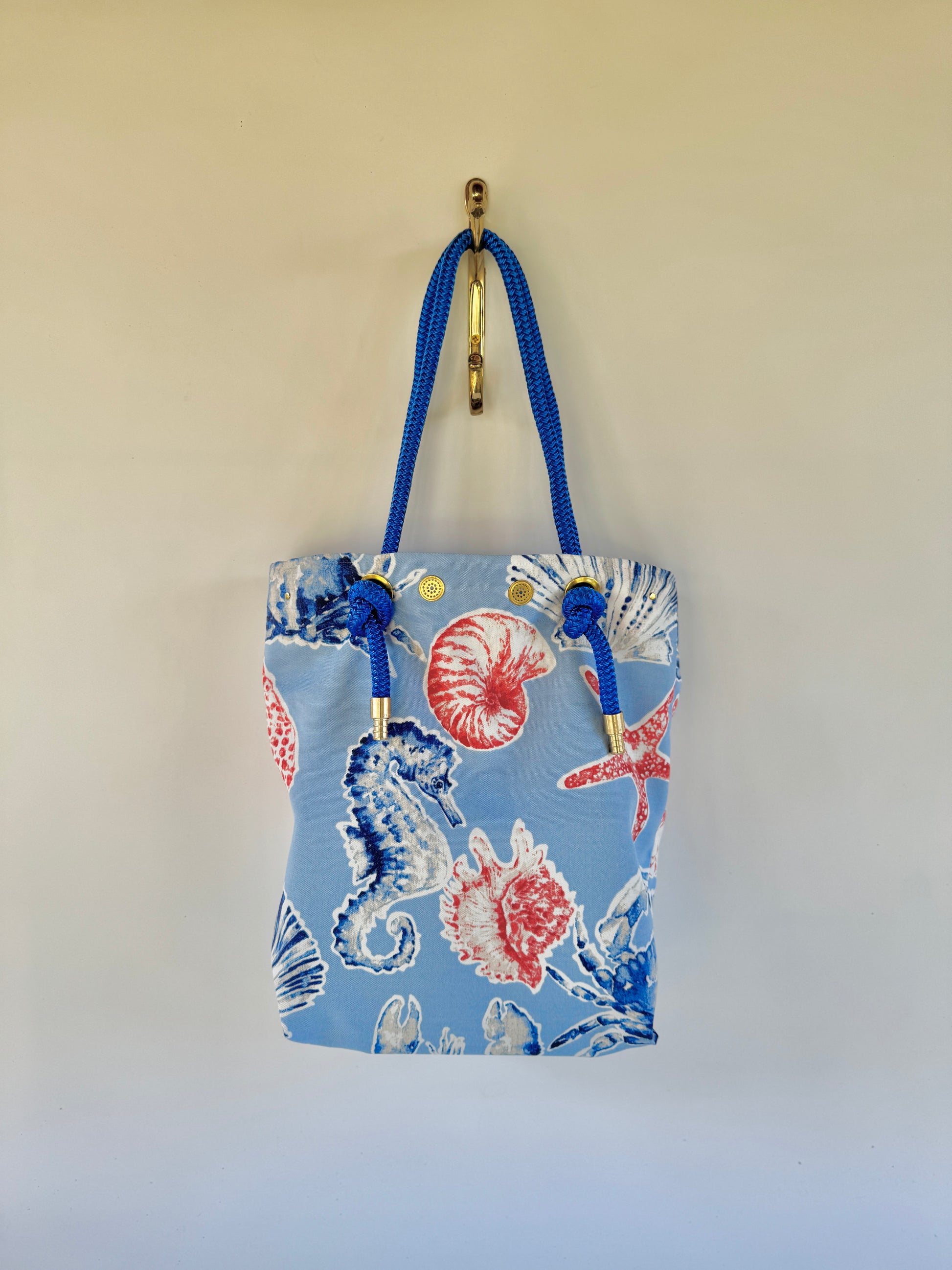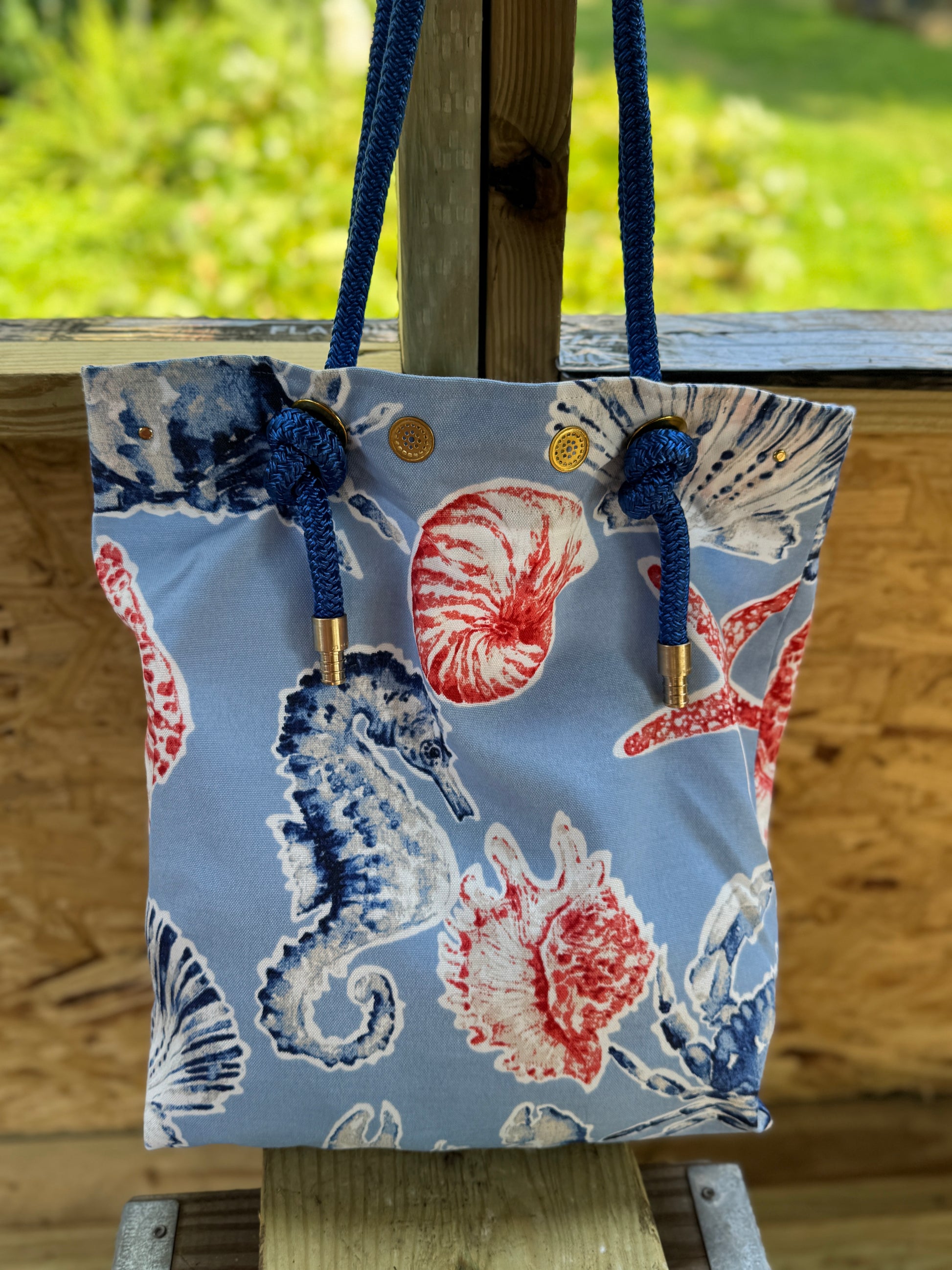 Premium Fabric in pale blue with marine life print - fabric is resistant to fading, stains, mold and mildew as well as water resistant. beautiful bag is festooned with an array of accoutrements Including: