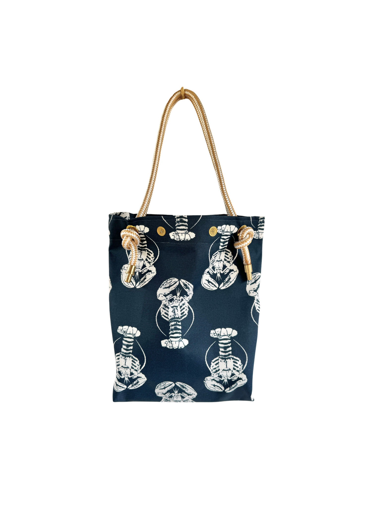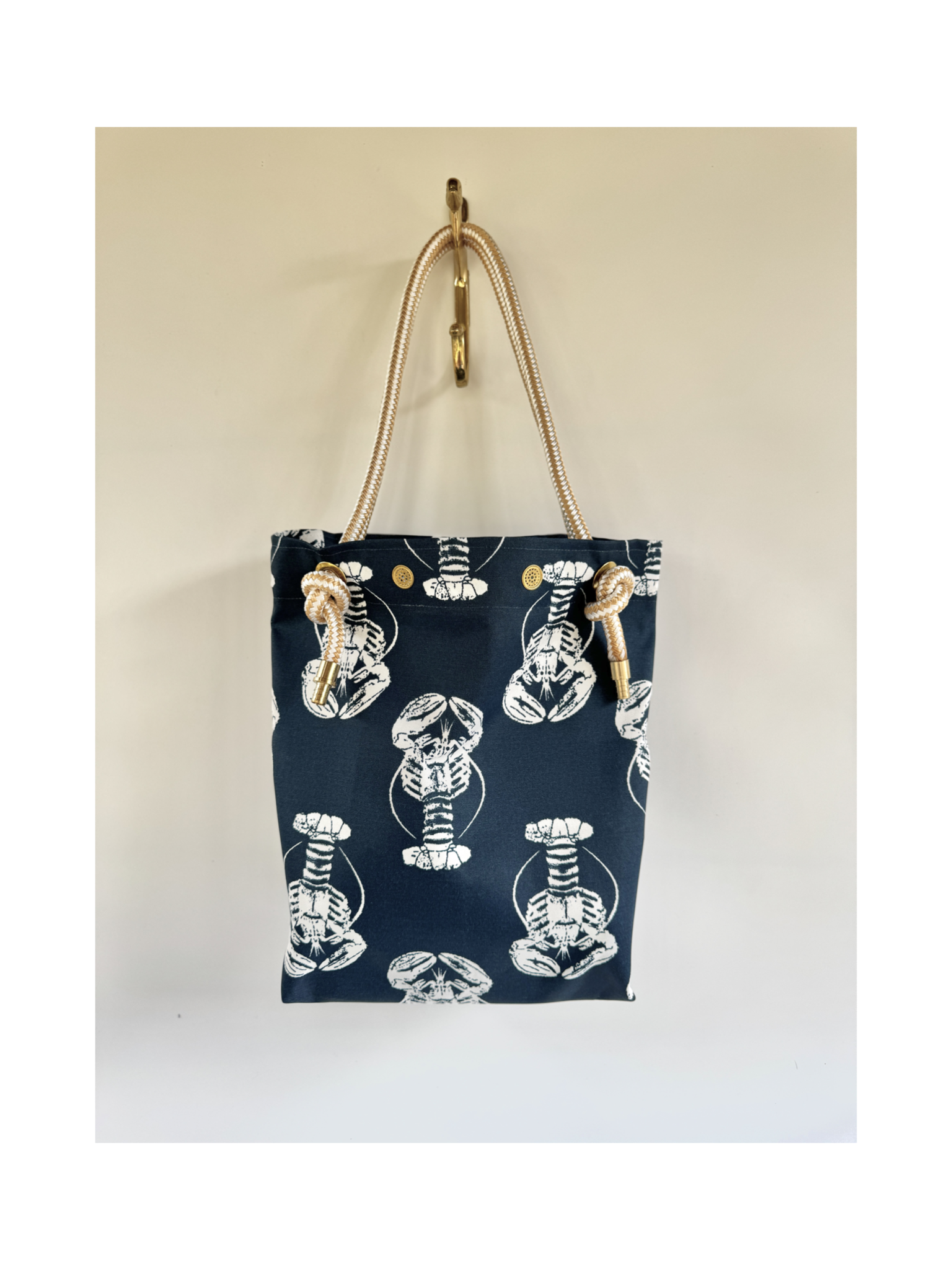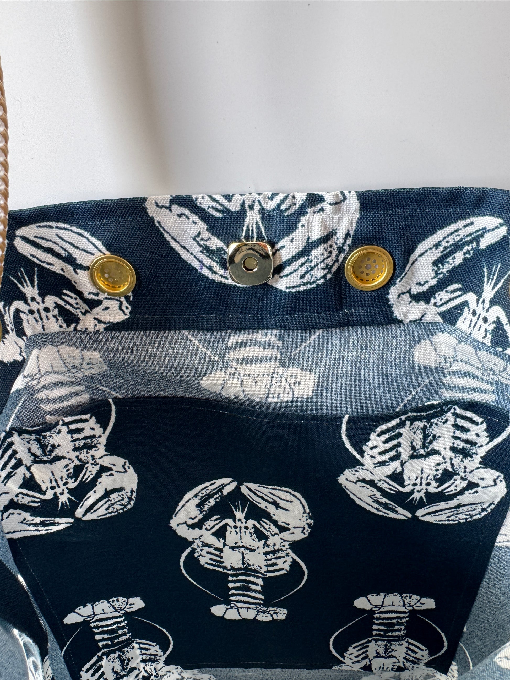 Premium Fabric in oxford blue with white lobster print - fabric is resistant to fading, stains, mold and mildew as well as water resistant. beautiful bag is festooned with an array of accoutrements Including: