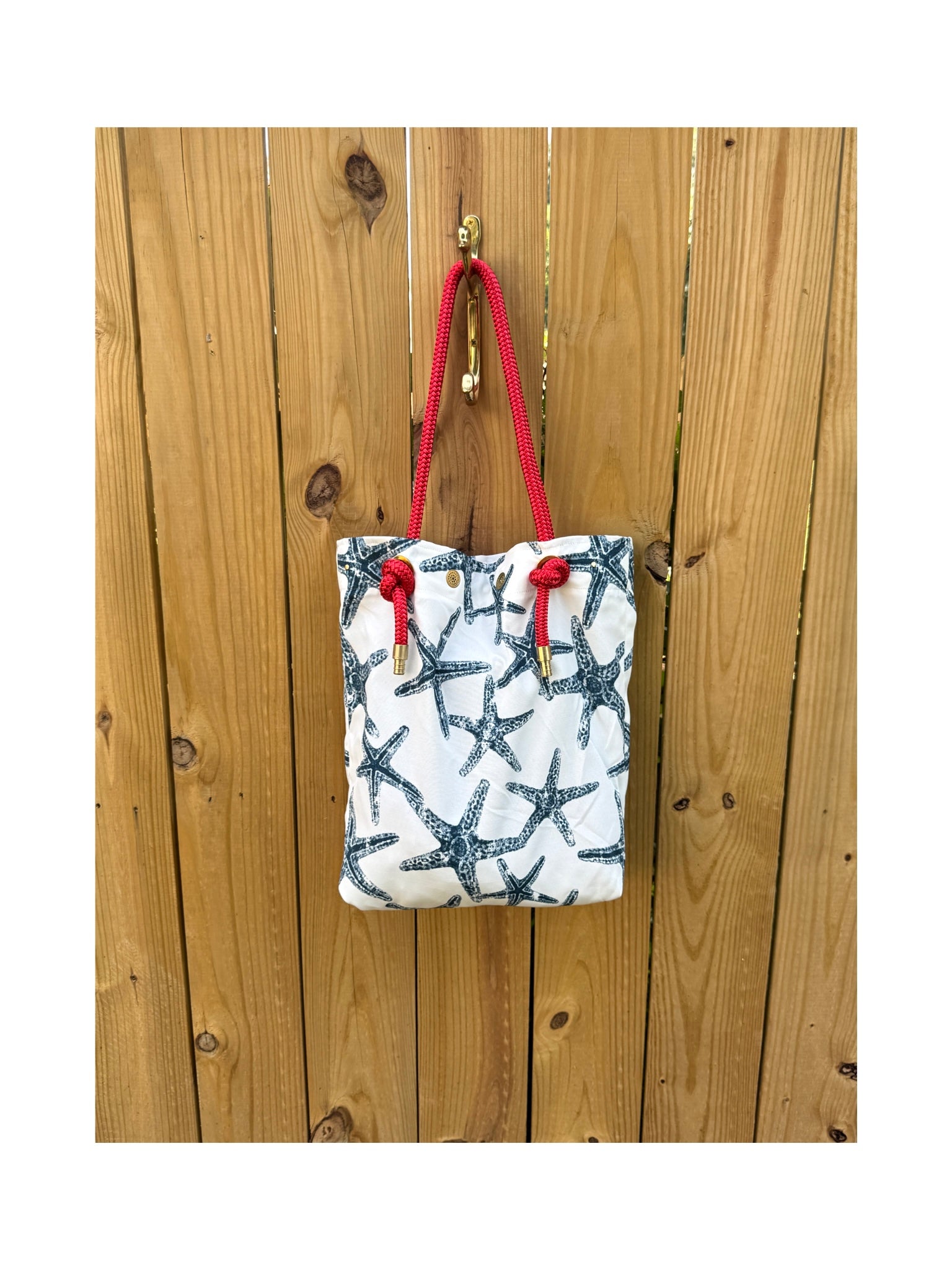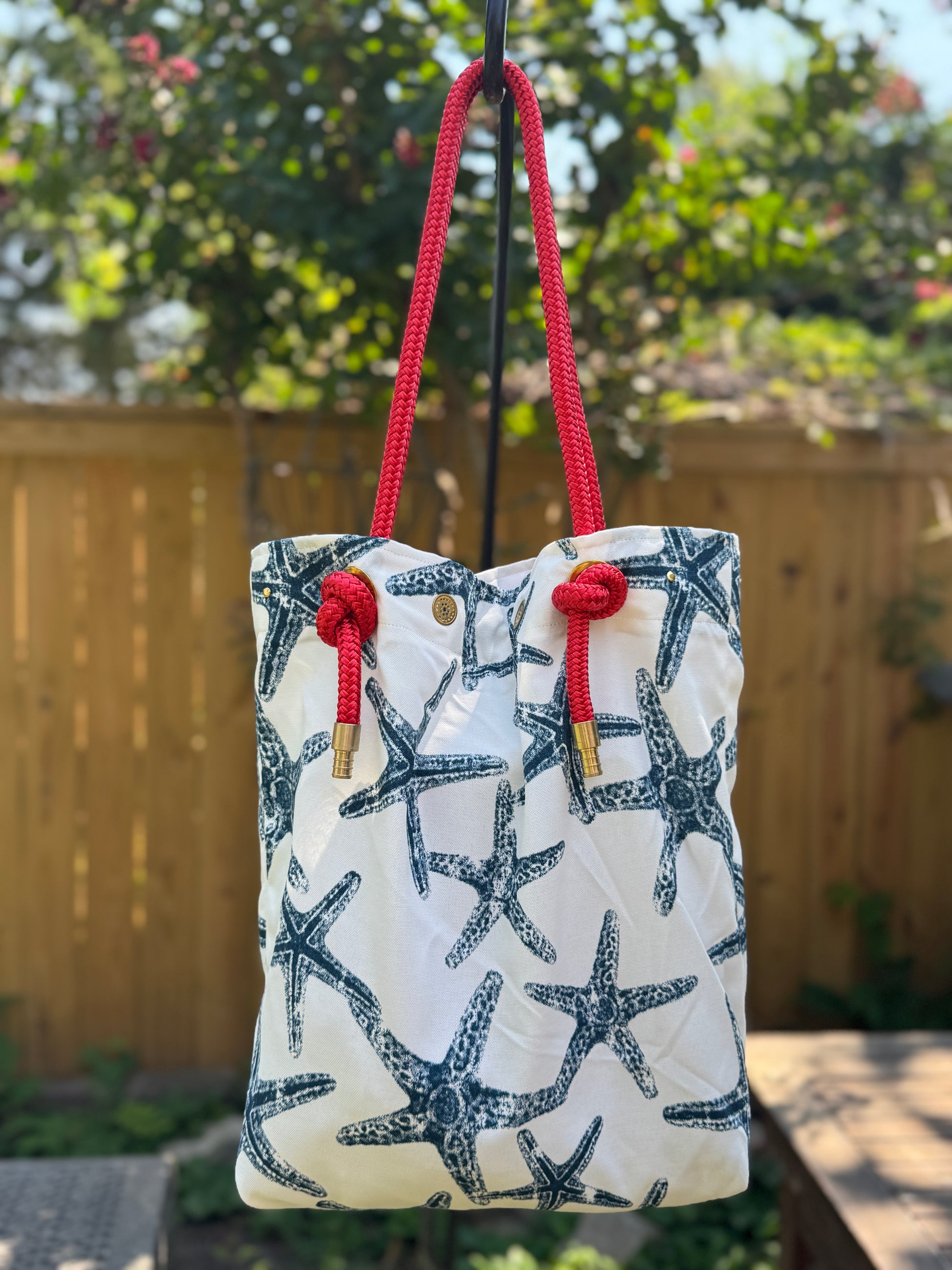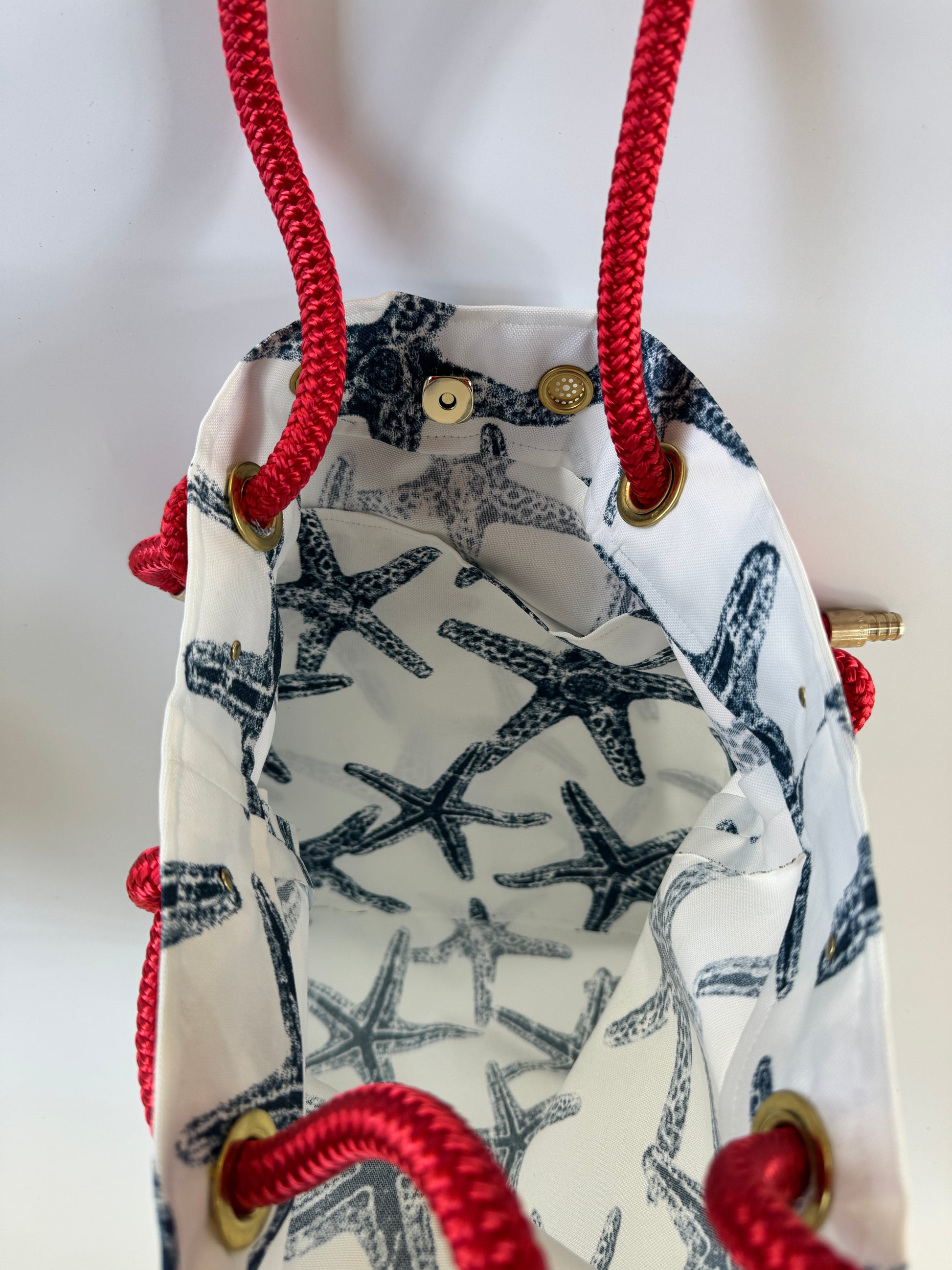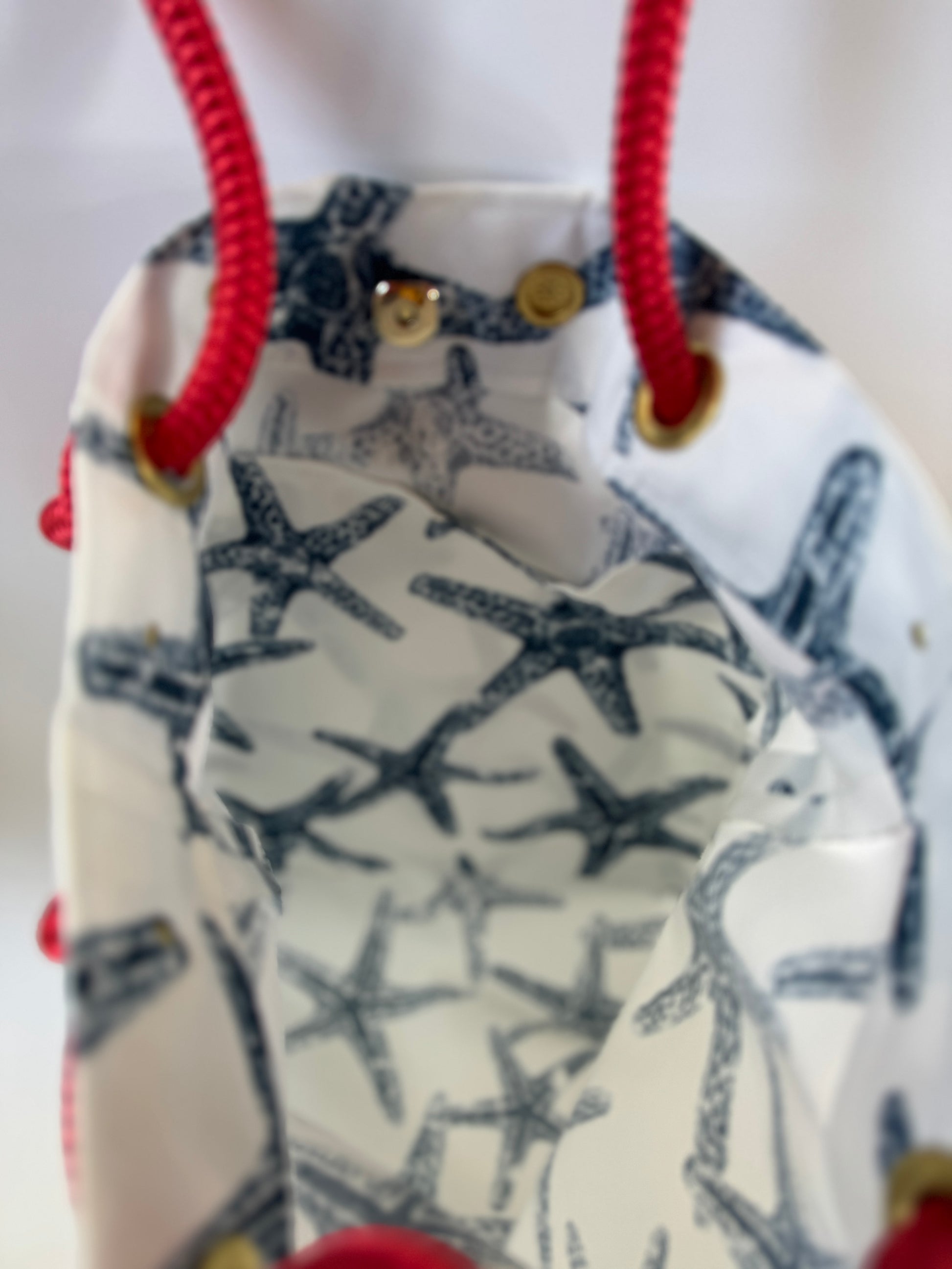 Premium Fabric in white with navy blue starfish print - fabric is resistant to fading, stains, mold and mildew as well as water resistant. beautiful bag is festooned with an array of accoutrements Including: