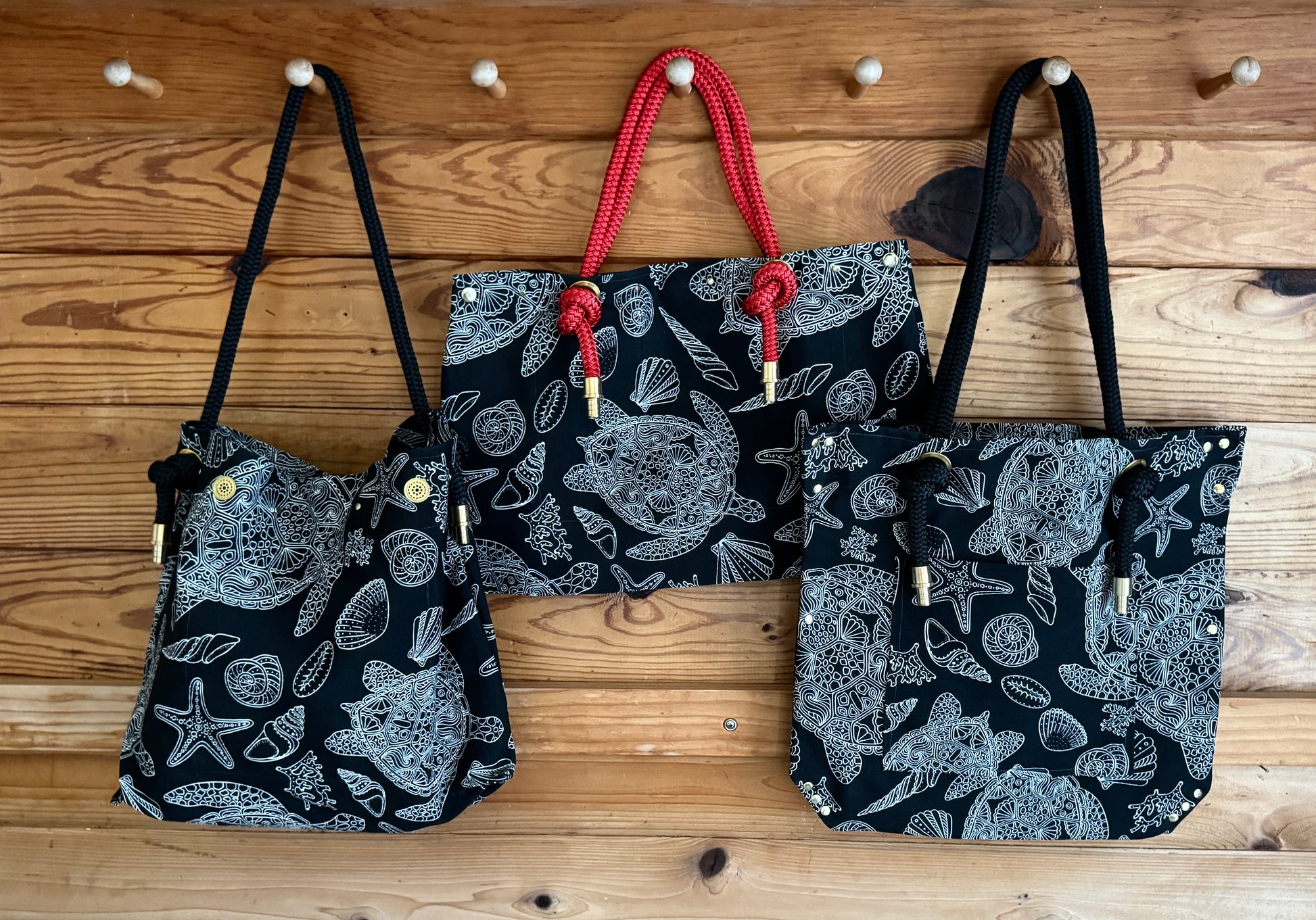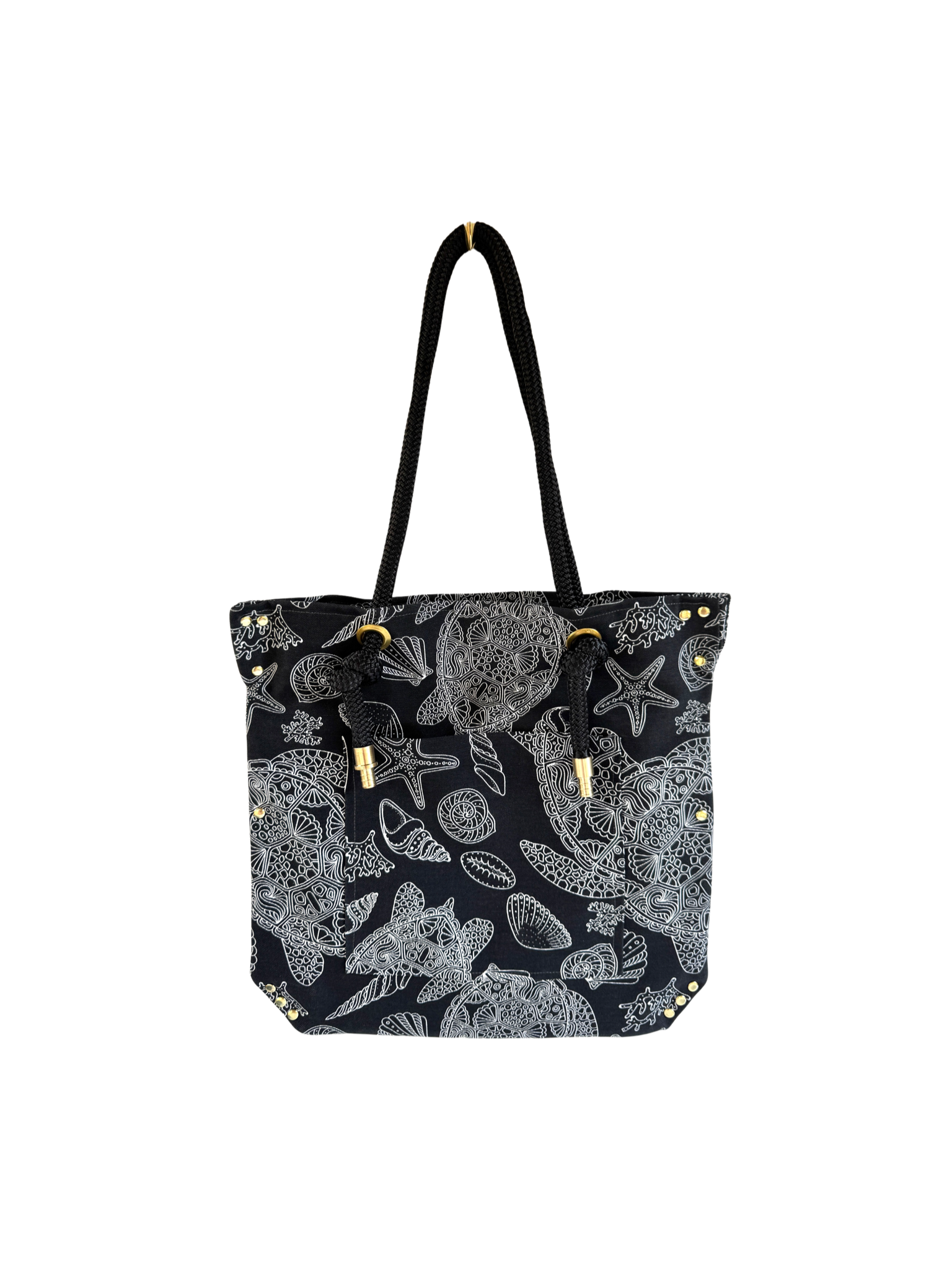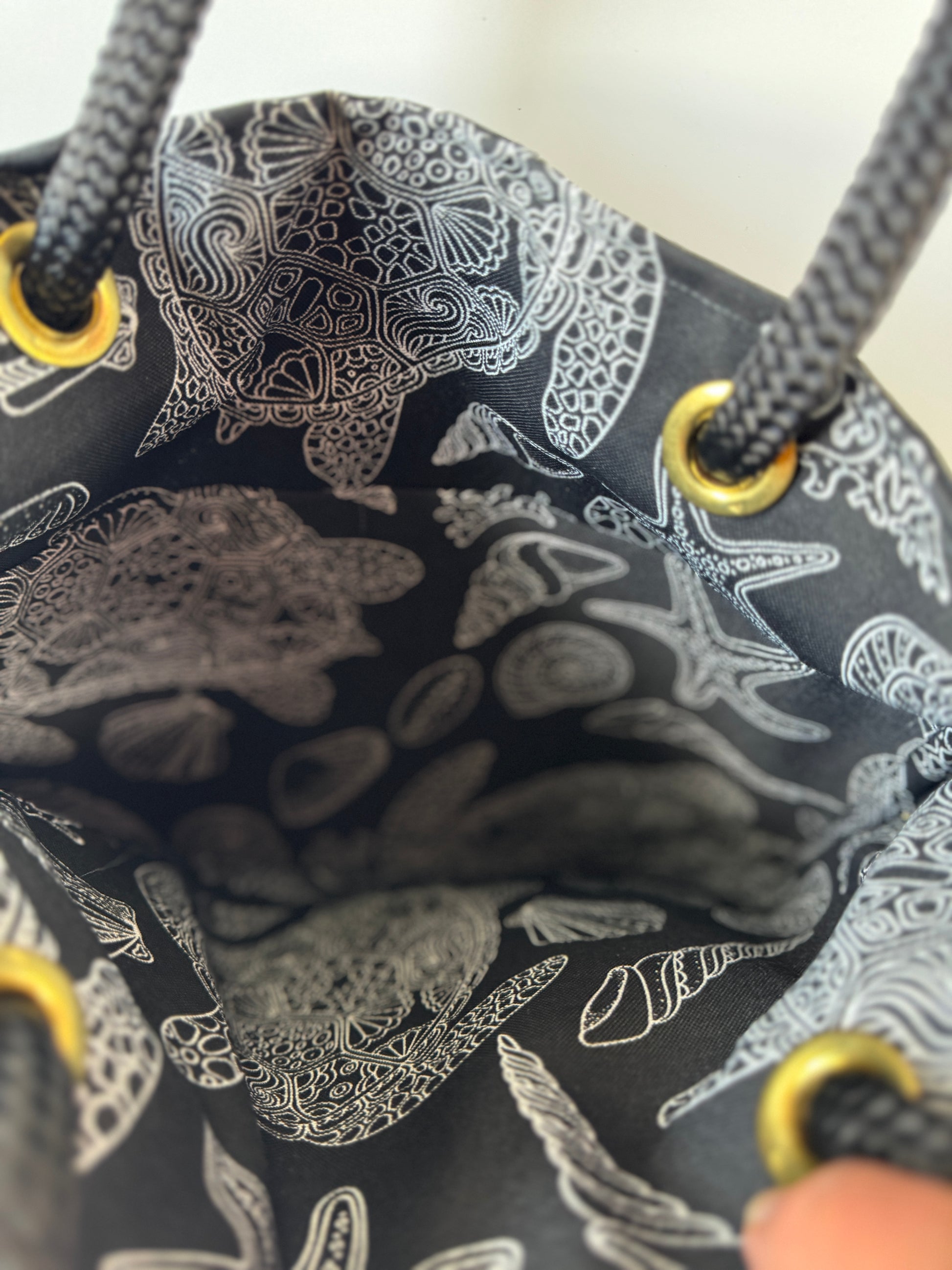 Premium Fabric in black with turtle and shell print - fabric is resistant to fading, stains, mold and mildew as well as completely water proof.