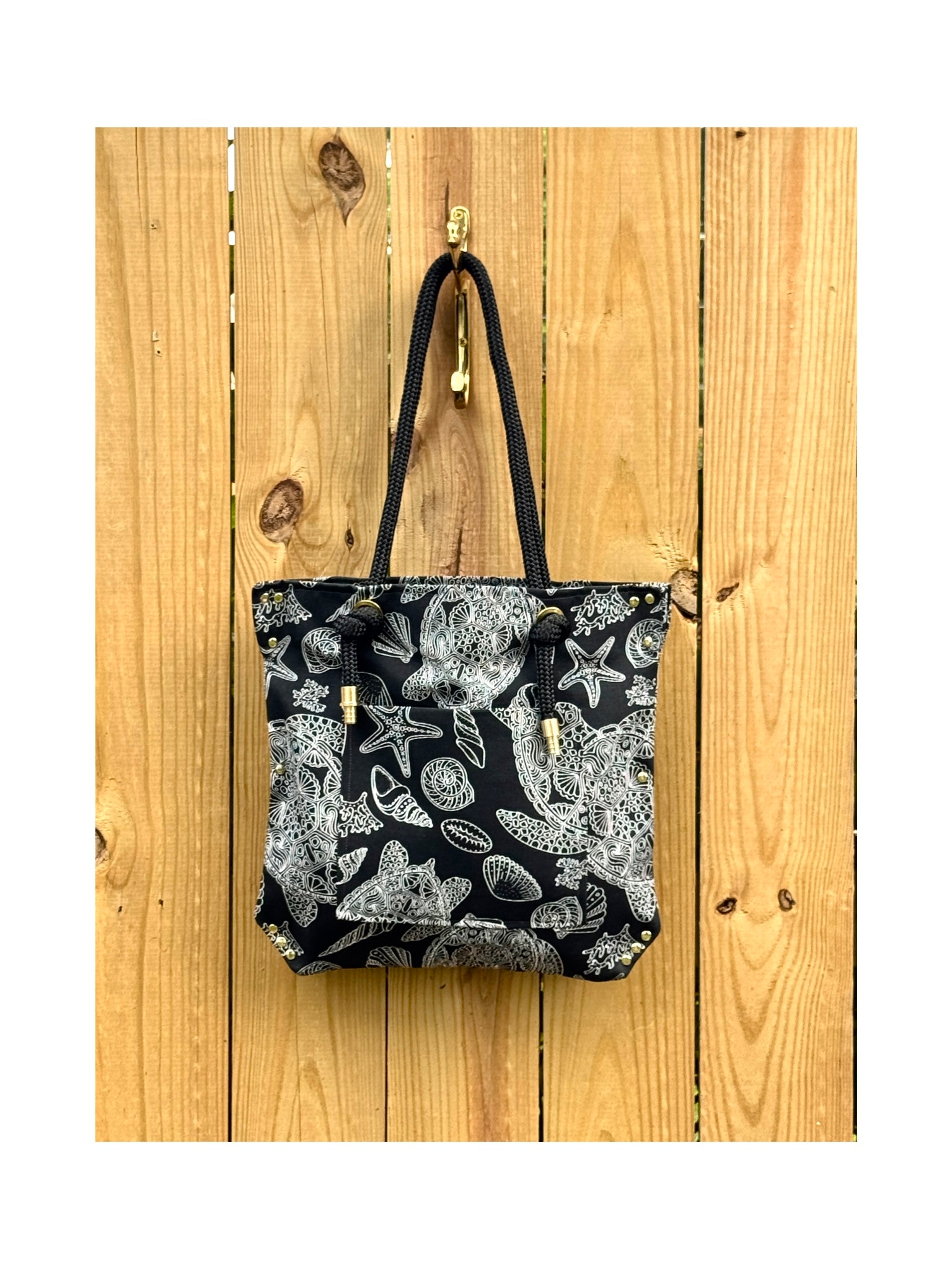 The Tippy Tote for all the Nauti-Lasses who like their slim can sodas! This fun tote has two deep interior pockets and one large exterior pocket for stashing your stuff. Trimmed out with grommets, rivets and a magnetic closure it's the perfect tote bag for year round use. Please allow 5-7 days for production.