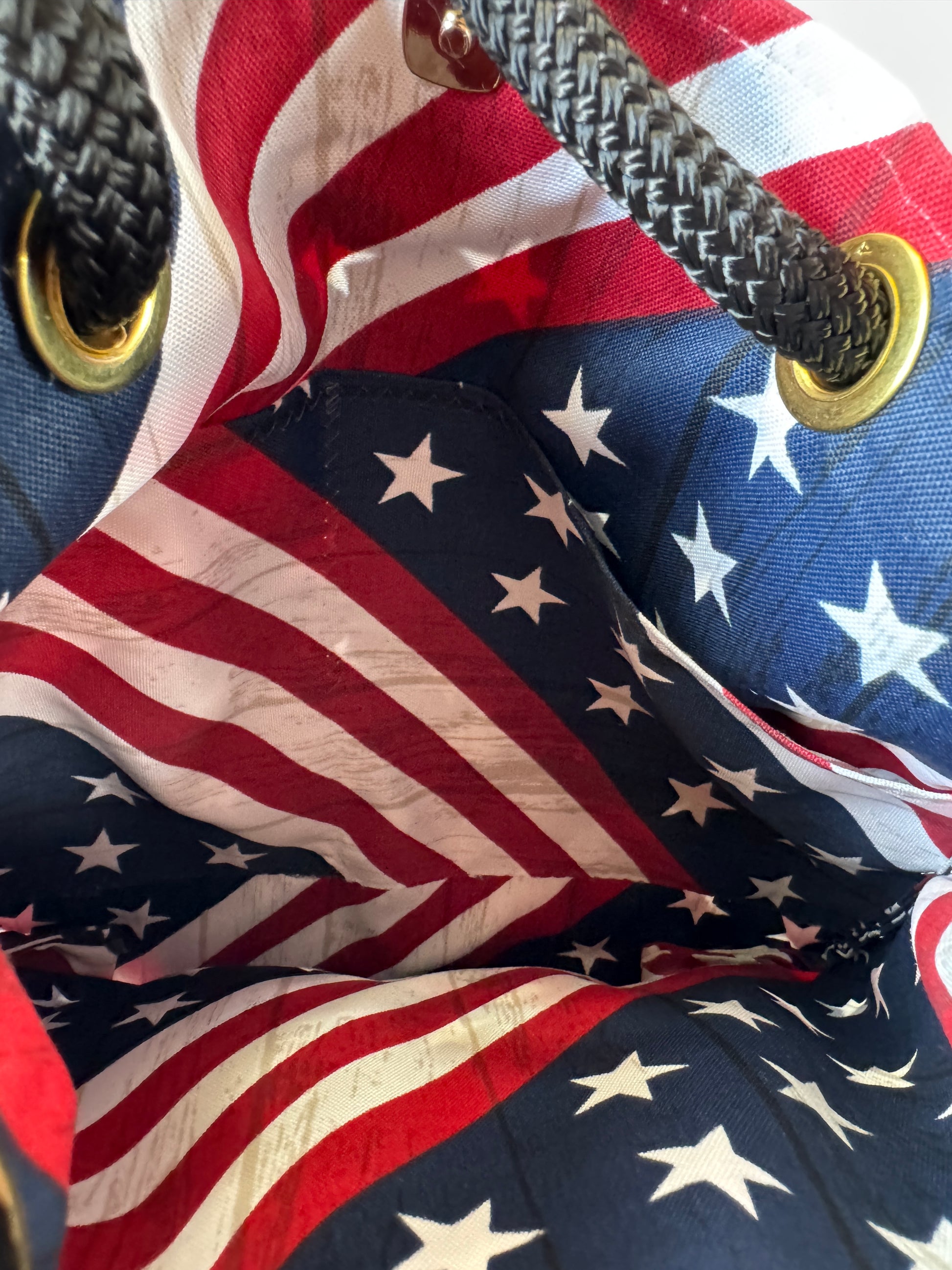 Premium Fabric in vintage american flag print - fabric is resistant to fading, stains, mold and mildew as well as completely water proof.