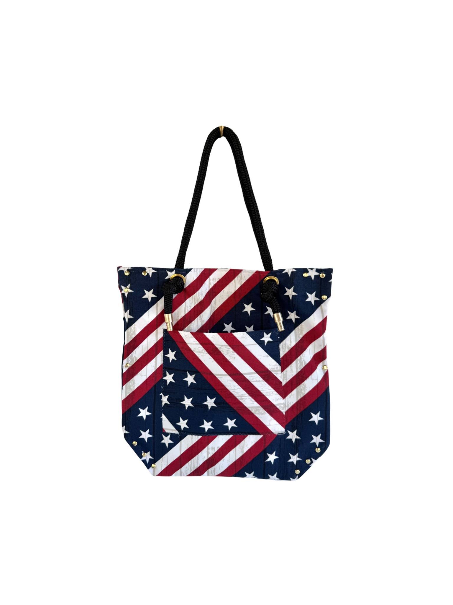 The Tippy Tote for all the Nauti-Lasses who like their slim can sodas! This fun tote has two deep interior pockets and one large exterior pocket for stashing your stuff. Trimmed out with grommets, rivets and a magnetic closure it's the perfect tote bag for year round use. Please allow 5-7 days for production.