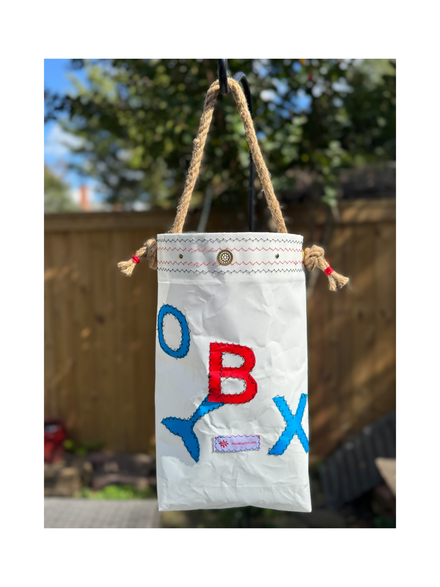 White Sailcloth Bag with Blue Fish Eye on front and OBX Fish Tail lettering on the back.